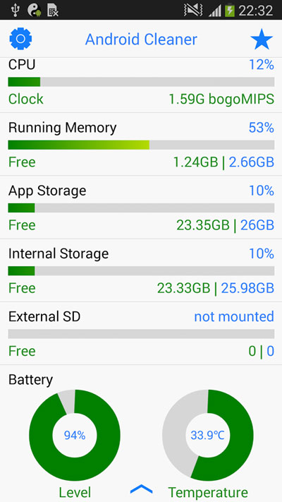 ✤ تمیز کننده حافظه پنهان برنامه (پاک کننده کش) ✤ پاک سازی حافظه برنامه (پاک کننده حافظه). کشتن برنامه های ناخواسته در حال اجرا در پس زمینه ✤ پاک سازی تاریخچه ✤ نظارت بر مصرف CPU, RAM, ROM و SD به صورت لحظه ای ✤ مشاهده اطلاعات دقیق سخت افزار و سیستم عامل ✤ و …