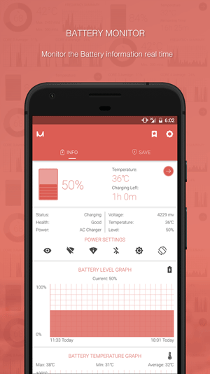 ★ مانیتورینگ باتری نمایش منحنی استفاده از باتری و درجه حرارت. وضعیت باتری را نظارت کنید: سلامت، وضعیت برق، ولتاژ، سطح.
