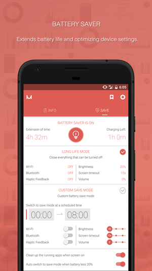 ★ صرفه جویی در باتری عمر باتری را افزایش می دهد و تنظیمات دستگاه را بهینه می کند. شما می توانید “MODE LONG LIFE” یا “CUSTOM SAVE MODE” را انتخاب کنید.