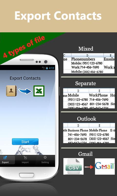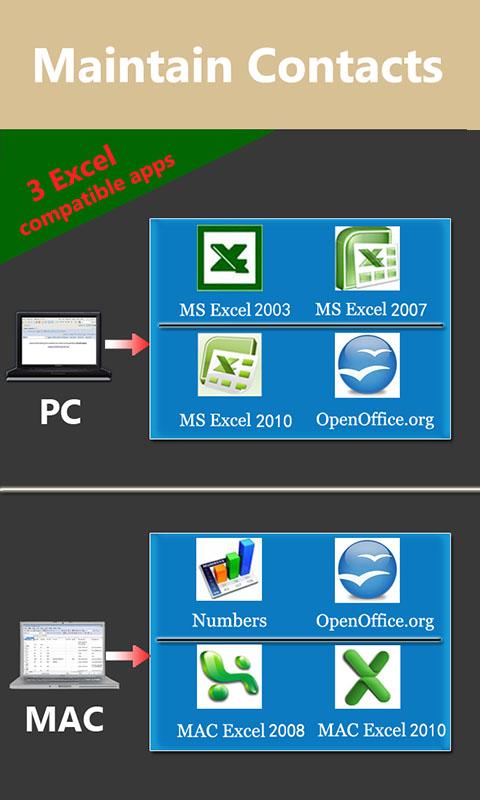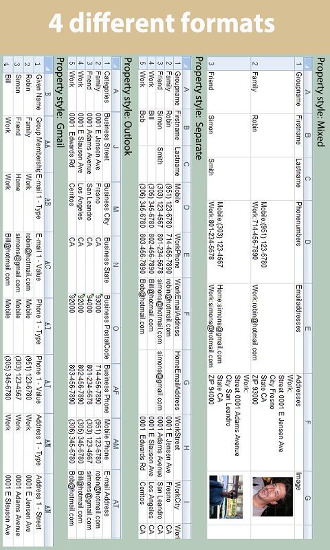 1. بروز رسانی، تغییر و نگه داشتن آسان مخاطبین خود بر روی کامپیوتر با استفاده از Excel، OpenOffice یا هر برنامه سازگار با Excel 2- ExcelContacts تمام مخاطبین شما را توسط ایمیل، کارت حافظه SD یا Dropbox از تلفن به یک فایل ZIP مناسب می فرستد. همچنین تصویر مخاطبین نیز ارسال می شود! 3- فایل Zip برنامه ExcelContacts شامل تمام اطلاعات مخاطبین شما در یک فرمت آسان و مناسب می شود. 4- بازیابی یا تغییر آسان مخاطبین از صفحه گسترده و از طریق آپلود فایل به گوشی شما از طریق USB؛ ایمیل، Dropbox یا Google Drive. این نمی تواند آسان تر از این باشد! 5- امکان تهیه پرینت از مخاطبین گوشی شما 6- امکان استخراج مخاطبین گوشی در یک فایل Excel که می توانید آنها به صورت مستقیم به مخاطبین Outlook وارد کنید. 7- امکان وارد کردن مخاطبین از فایل اکسل که از Outlook به گوشی شما صادر شده اند. 8- امکان وارد کردن/خروجی گرفتن مخاطبین تلفن به/از یک فایل فرمت CSV جیمیل (کدگذاری شده UTF-8 یا Unicode) 9- تمام گزینه های مخاطبین به جز آهنگ زنگ امکان وارد کردن و خروجی گرفتن را دارند. 10- سازماندهی آسان مخاطبین خود به گروه ها بر روی یک صفحه گسترده و اختصاص دادن یک مخاطب به گروه های متعدد 11- امکان حذف تمام مخاطبین یا گروه ها قبل از وارد کردن مخاطبین سازمان یافته شده شما 12- پشتیبانی از بیش از 10.000 مخاطب 13- محلی کردن(localized) تمام ستون ها و برچسب در فایل اکسل 14- صادرات یک فایل اکسل با تمام عکس ها: این باعث می شود اطلاعات تماس در صفحه گسترده بهتر دیده شود. 15- امکان محافظت از فایل خروجی توسط رمز عبور 16- صادرات/واردات مخاطبین به/از فایل VCF 17- پشتیبان گیری زمانبندی شده: امکان پشتیبان گیری خودکار از تمام مخاطبین شما به Dropbox، Google Drive و کارت SD 18- امکان صادرات/واردات بدون محدودیت مخاطب