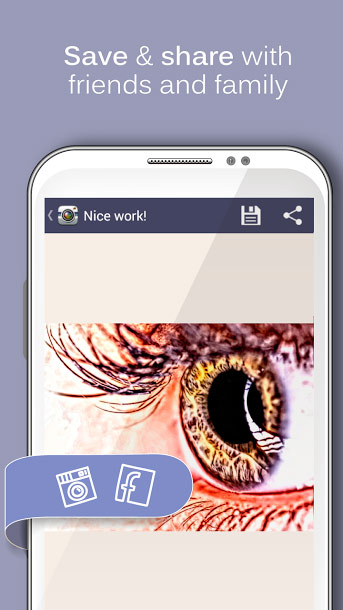 ✤ استفاده از عکس های گالری، دوربین و فیس بوک ✤ دسته بندی ها: فیلترها، 3D، Combos، بوکه(Bokeh)، قاب ها، بافت ها، الگو ها و براش ها ✤ بوک مارک علاقه مندی ها ✤ بیش از 100 افکت باز شده جذاب ✤ و …