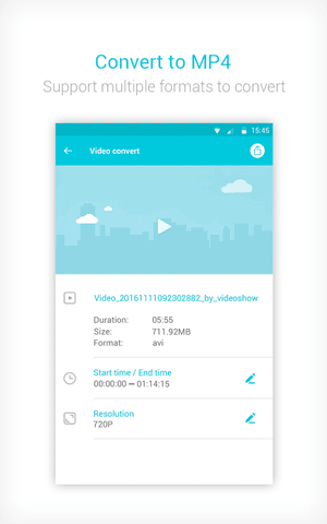 – فیلم ها را به فایل های MP4 با کیفیت بالا تبدیل می کند. – پشتیبانی از تبدیل تقریبا تمام فرمت های فایل ویدیویی، از جمله HD، AVI، MKV، FLV، RMVB، 3GP، MPEG، WMV، MOV و دیگر فرمت ها. – استفاده راحت و سریع ★ فشرده سازی و برش دادن فیلم – رابط کاربری ساده، تازه و مختصر مانند تمام برنامه های VideoShow، مینیمالیستی است. – بدون هزینه اضافی برای استفاده از تمام توابع. – پشتیبانی از بیش از 30 زبان. – پشتیبانی از بیش از 200 دستگاه Android، Blackberry، Lumia، Samsung Galaxy، Sony، Huawei …